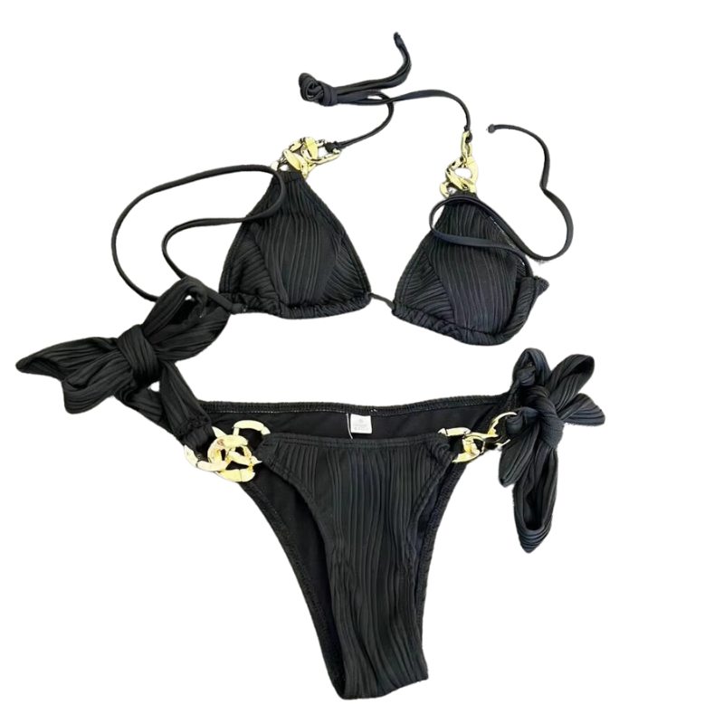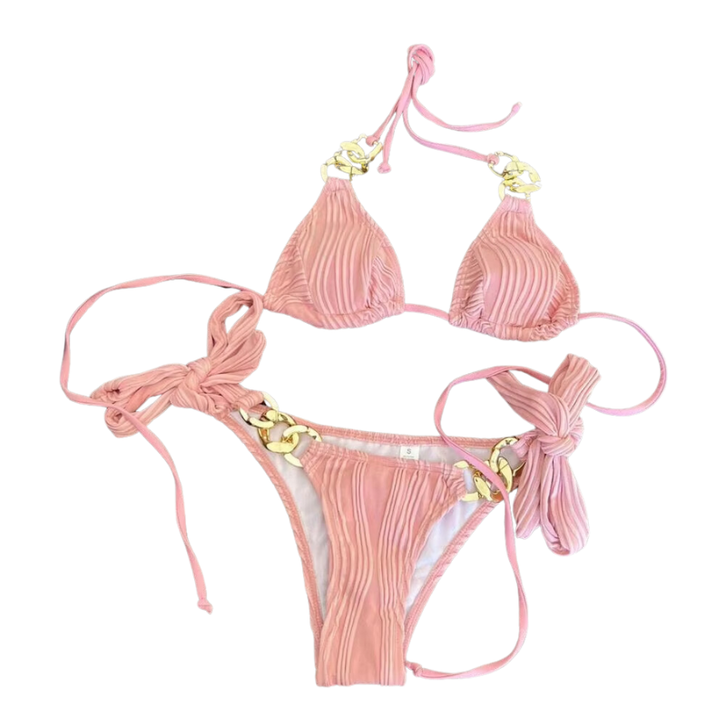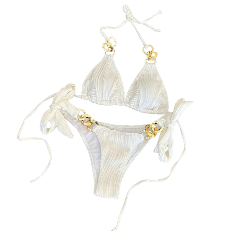 Ten strój kąpielowy jest idealny na wakacje, na plażę lub basen. Jest to strój idealny dla odważnych kobiet, które cenią sobie wygodę i styl. Bikini to idealna opcja też dla tych kobiet, które chcą podkreślić swoją figurę i wyróżnić się na plaży lub przy basenie. Ten strój kąpielowy składa się z nieusztywnianego biustonosza i brazylijskich majtek, które zapewniają swobodę ruchów i komfort podczas noszenia. Wzór jest gładki, nie ma na nim żadnych wzorów lub druków tylko marszczenia materiału. To sprawia, że strój kąpielowy z łańcuchem jest uniwersalny. Cechą charakterystyczną tego bikini są wspomniane łańcuchy, które znajdują się na biodrach i ramiączkach. Dodają one eleganckiego pazura temu strojowi, jednocześnie podkreślając kobiecą figurę.