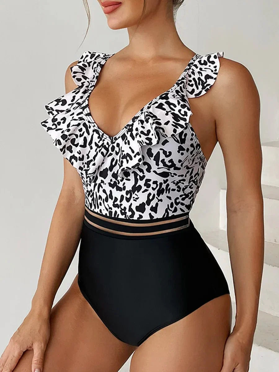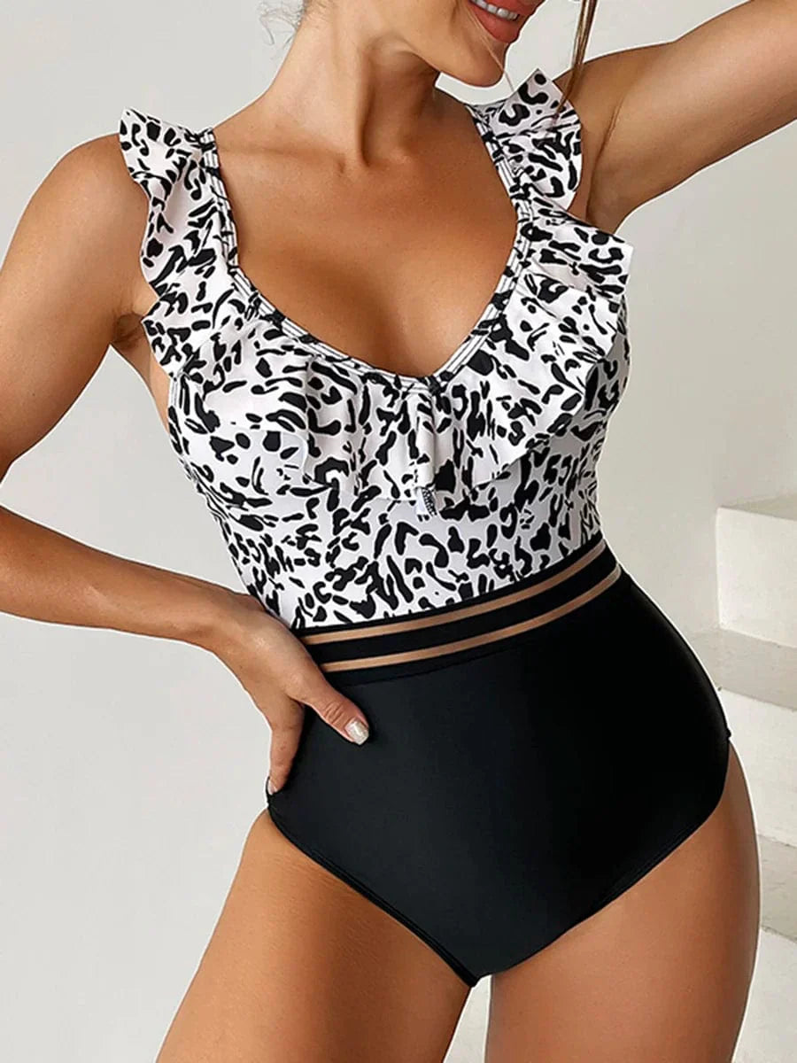 Falbana oraz skrzyżowane ramiączka nadają charakteru, a regulowane elementy zapewniają wygodę noszenia. Przezroczyste paski delikatnie akcentują talię, tworząc zmysłowy efekt, który z pewnością przyciągnie spojrzenia.