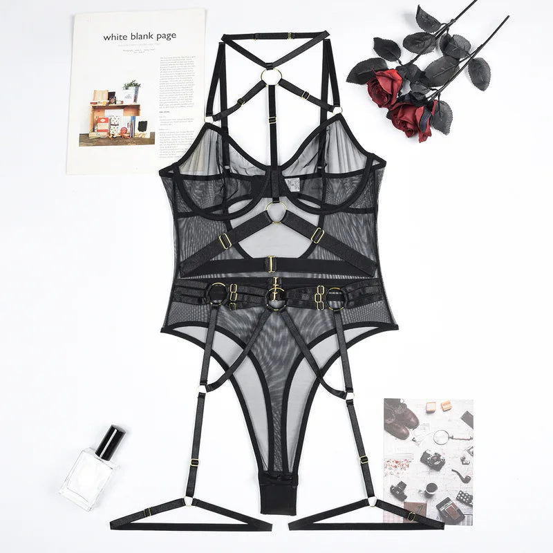 Odkryj swoją zmysłową stronę w naszym prześwitującym body damskim z harnessem. W kolorze czarnym, z ozdobnymi paskami, regulowanymi ramiączkami oraz wycięciem na plecach, to idealny wybór na randkę, walentynki czy imprezę - poczuj się wyjątkowo i wyraź swój indywidualny styl.