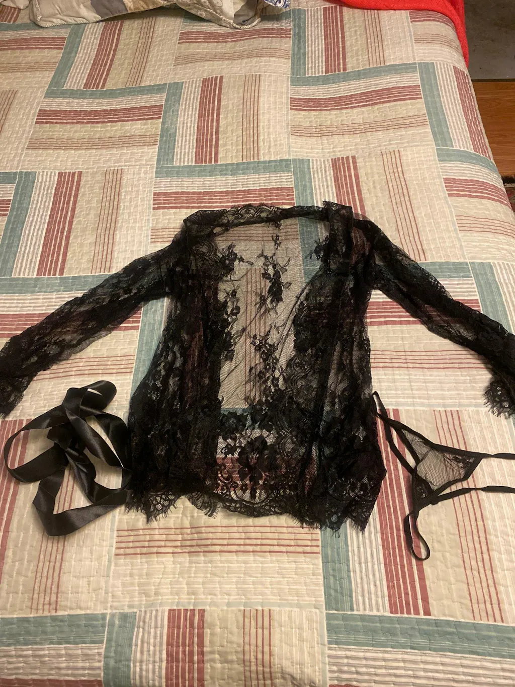 Prześwitujący koronkowy szlafrok z ozdobnym paskiem